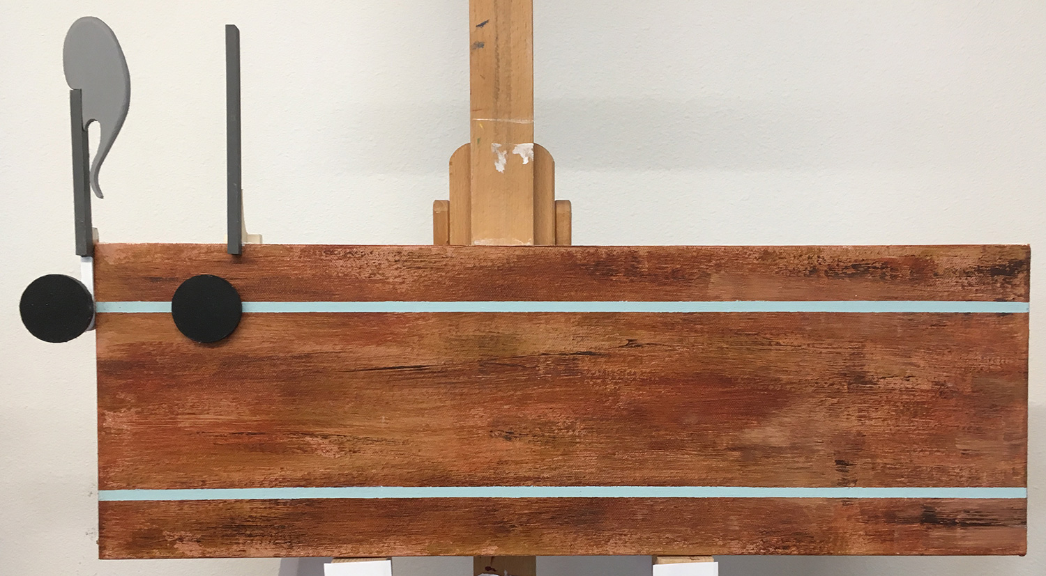 Like my recent works this project will be small, because of the complicated issues of building the music.  Consider that unlike using paint applied to the canvas surface to define my music,  I am applying a three-dimensional object that is the music.  Those two notes you see in image one, all sit on top of the canvas. Because they are the first pieces,  and the guides for the rest of the music,  it took parts of a whole day in the Studio to correctly  place and mount them securely.