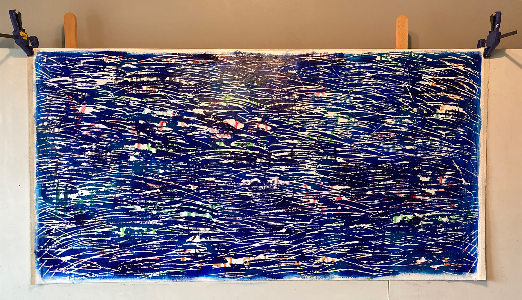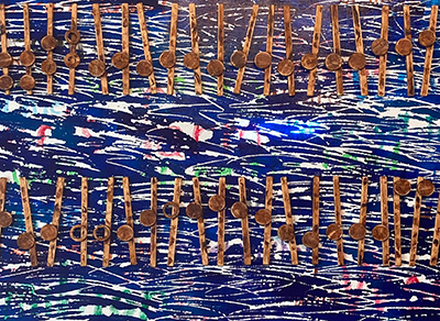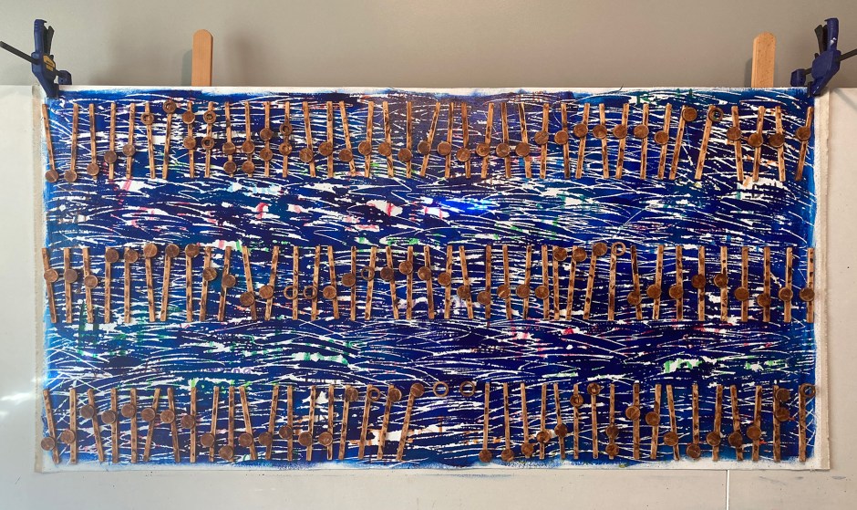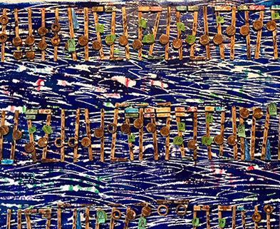 Looking at the above photograph and then turning around to the artwork, the difference is striking. The photo lacks the third-dimension, which then allows the background to dominate the artwork in a kaleidoscope of movement, shapes and colors. Looking at the life-sized original artwork, the music physically stands out, creating a better balance with the background. This allows to music to capture the viewer with its own up and down, and back ‘en forth animation.