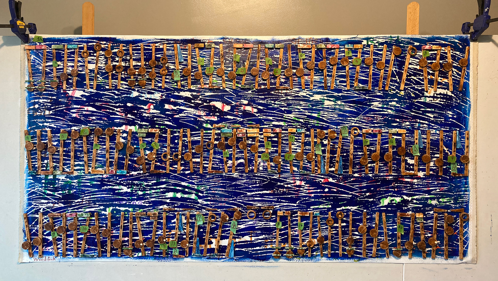 This image shows the artwork project, Woodstock, with most of the add-on’s in place, and the artwork in a near finished look. I have left all my temporary pieces of numbered tapes to record this moment that shows the system used to locate and place the beaming and all the other add-ons such as slurs, ties, incidentals, eighth note flags, and as a guide for the dotted notes. Every one of these artworks builds on a past artwork’s style, but their construction needs vary from each other. This photo may help future projects as I move from mistake to mistake and problem to problem.