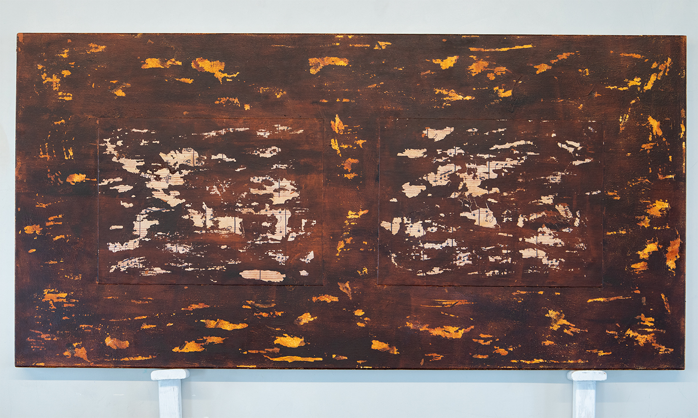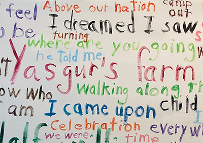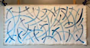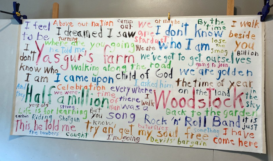 This idea of removing paint to expose more than another layer of paint originates with my Bach Menuet. For that work I glued a copy of Bach’s handwritten music to the background of the canvas and then scraped off the final topcoat to expose the sheet music. This same idea works with the lyrics from Woodstock. When revealed the words add color and connection to the music and the artwork.