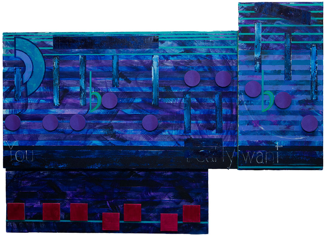 losing My Edge  _9Same this one shade of blue for the words, and that worked out perfect.  I was also able to find a spot for medium magenta with the curve line, a slur in music notation.  My last big change will be with the area around those  magenta square musics pieces that I have saved.  I have and idea what I want to accomplish, it is just that I have no idea how to make that happen.  For, like the beams, I may have to contend with trying one idea after another, while keeping a fresh damp cloth ready to wipe away my work.