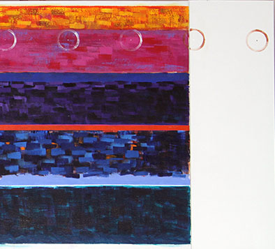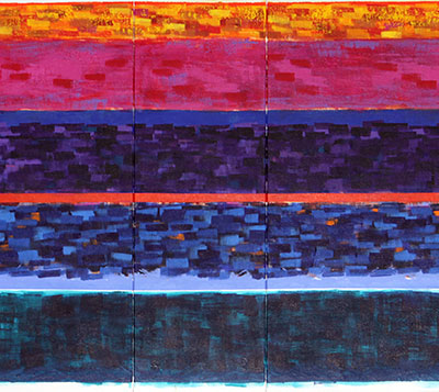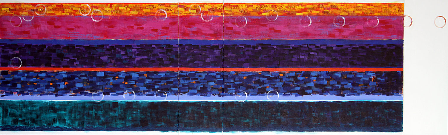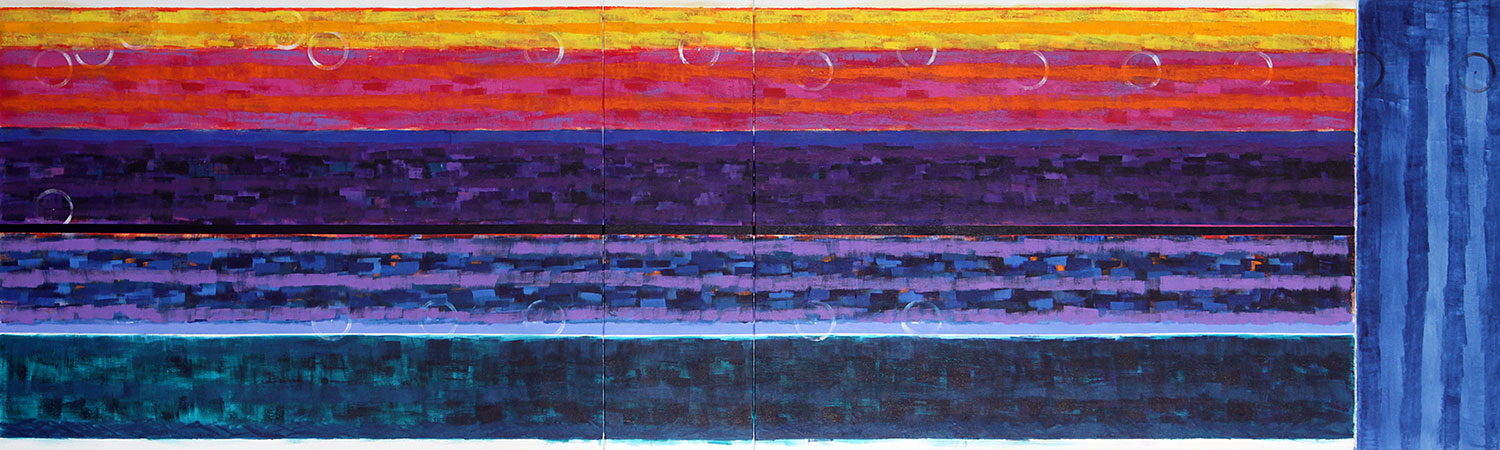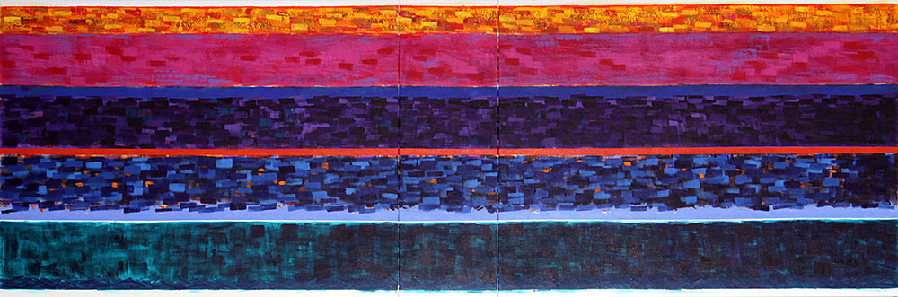 Vivaldi’s The Four Seasons image4 1500 pixels or ten feet (3m) in length. As you can see this work has moved in a different direction, and now beginning to take on its own look. It started with the painting of the left panel with a Prussian Blue wash, that lead to the free hand addition of the darker Prussian strips. That looked worked so the obvious next step was to heavy line the flat upper magenta color band. That work, which lead to the additional lines across the lower bass section. Next the hard orange line across the middle seem out-of-place and too reminiscent of the orange bars across the magenta. After some failed attempts, a dark Prussian blue was used that seemed to pull the canvas towards that final vertical Prussian add on. It all worked with the final free handed lines being added to the top and middle sections. The loosely handed addition of these lines across all of this work brought back a touch of the feel of Mark Rothko, the artist that is a foundation of this art.