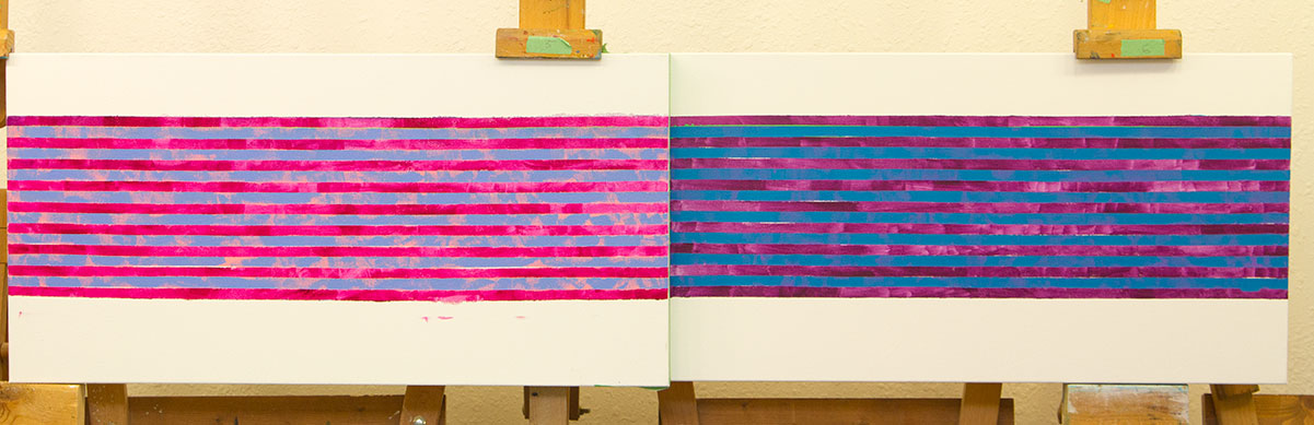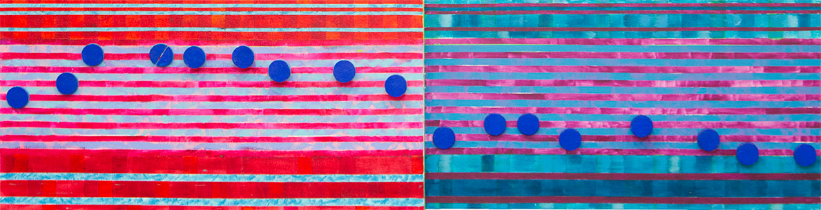 This is the second image of With a little help from my friends, that consists of two canvases fifteen inches by fifty-eight inches in length. What you are looking at, for now, is the finished background for the music. I did have a lot of issues in choosing the right mix of colors, because each of these panels represents a different emotion in the music.