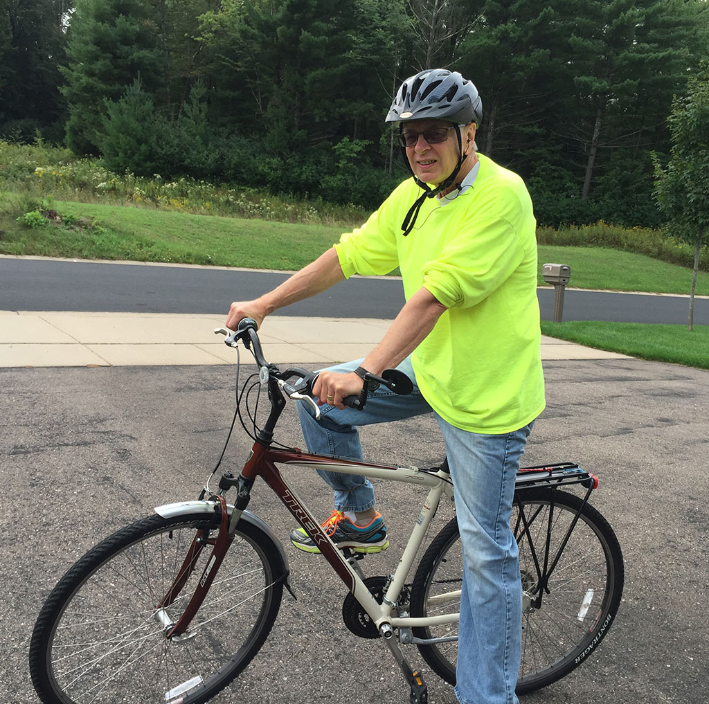 meOnBikeHere is how I connect the picture of me with my bike and my art. For exercise I travel a six-mile route, averaging around five-minute miles. What makes the course interesting is near the end I have a small hill and then a large hill to climb. The small hill is the warm up. The big hill I cannot bike up it, although I do walk up it.  Instead I approach the big hill from the backside, which is has a more gradual pitch to the top, and an exciting down the front ride.  Of course the backside trip still is extremely demanding. What I have learned to help me overcome this climb is that as I start to climb the steep part of the hill I tilt my head down looking at my front wheel and only a few feet in from of me.  By doing this I lose the sense of the height of the incline, and focus only on pedaling through the next few feet in front of me.  And it works, when suddenly I am at the top of the hill,  and can than relax.  That is also how I approach this art by focusing on the artwork in front of me and not the next great art project or what I should do to become the truly fine, and known, artist I wish to become. In biking I  hill climb by seeing only the road in front of my wheel.  In art I do much the same: I follow the road in front of me.