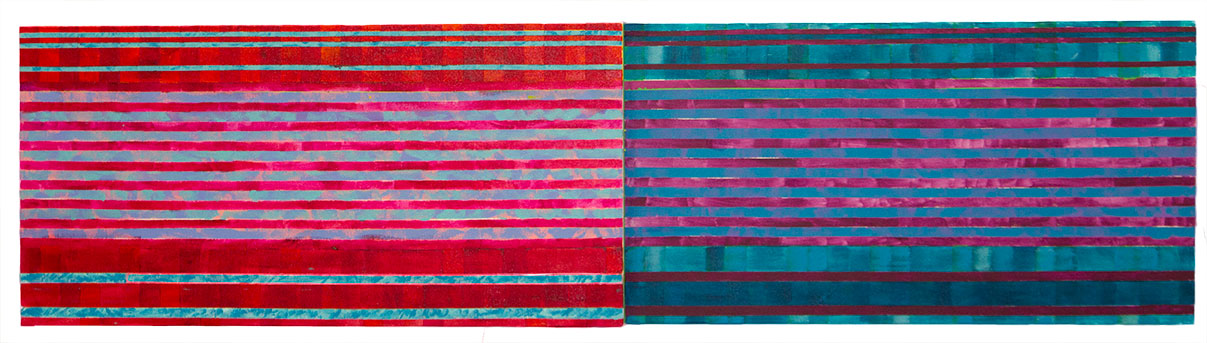 The music that I have chosen, in my chosen versions, goes from loud, and questioning, to soft and thoughtful. For the stronger left panel  bright colors seemed obvious.  Starting out with that first image I posted in an early blog entry,  I tried adding brighter yellow and lighter magenta colors.  This did not work. Finally in a spontaneous move I painted over those colors, leaving the blue and pink strips alone. I applied multiple transparent layers of Quinacridone red, that created different shades of red that brought that panel into harmony.