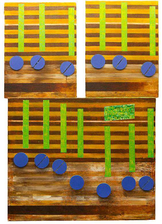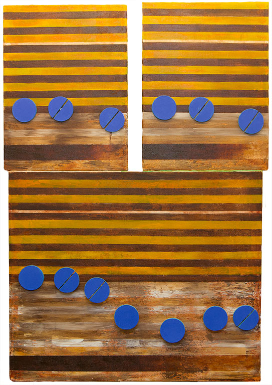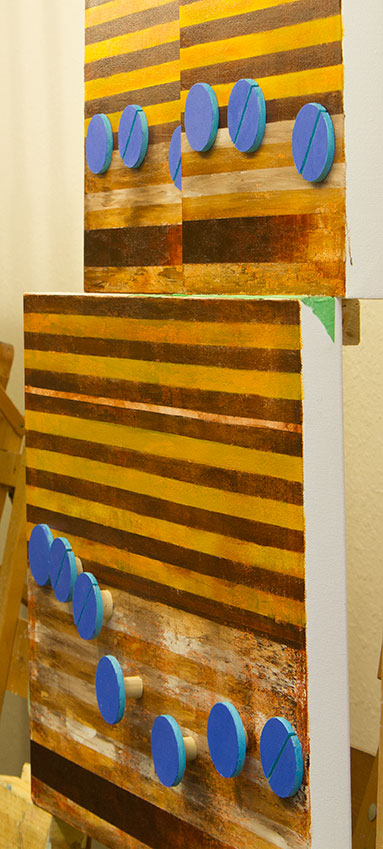 This is the final image a tribute painting to the music of Blind Melon, called No Rain. What is different about this artwork is that I did not follow my normal flow pattern for the music: horizontally from left to right. Rarely does it move vertically, which this artwork does. In No Rain the music flows left to right starting with the top left panel. It then hops over to the top right panel. The music flow then moves, left to right across the larger bottom panel. In order to improve the logic of this flow I decided to physically mount each panel at a different depth, creating a step movement in this work.