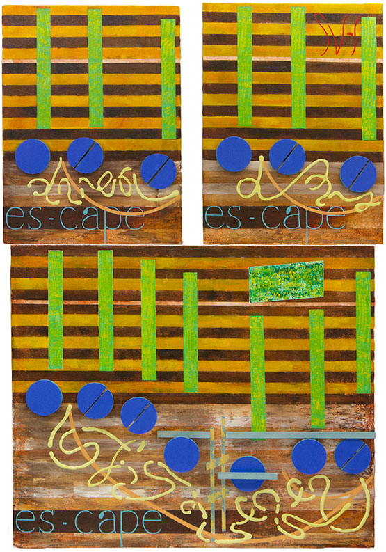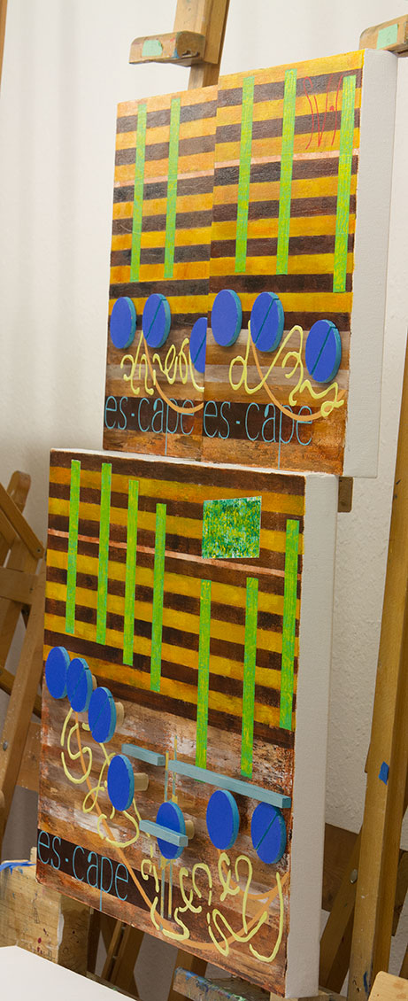I did not have to do it this way. An alternative design, typical of this art, would have been one longer horizontal combination of panels. I could have also created a horizontal stepped look (actually never considered) to this work following such examples as this years Birthday Painting, and last years Up on The Roof. I choose neither of these paths, and at first I could not remember my original thinking about this artwork. Then I remembered: if you listen to the music you will hear a series of short pauses after the word ‘escape.’ What it came down to was I wanted to create an artwork without displaying these stops in the music flow. And yet I wanted to keep up the logical movement of the music across this artwork. I realized I could reach these goals by placing each ‘escape’ on a different level.