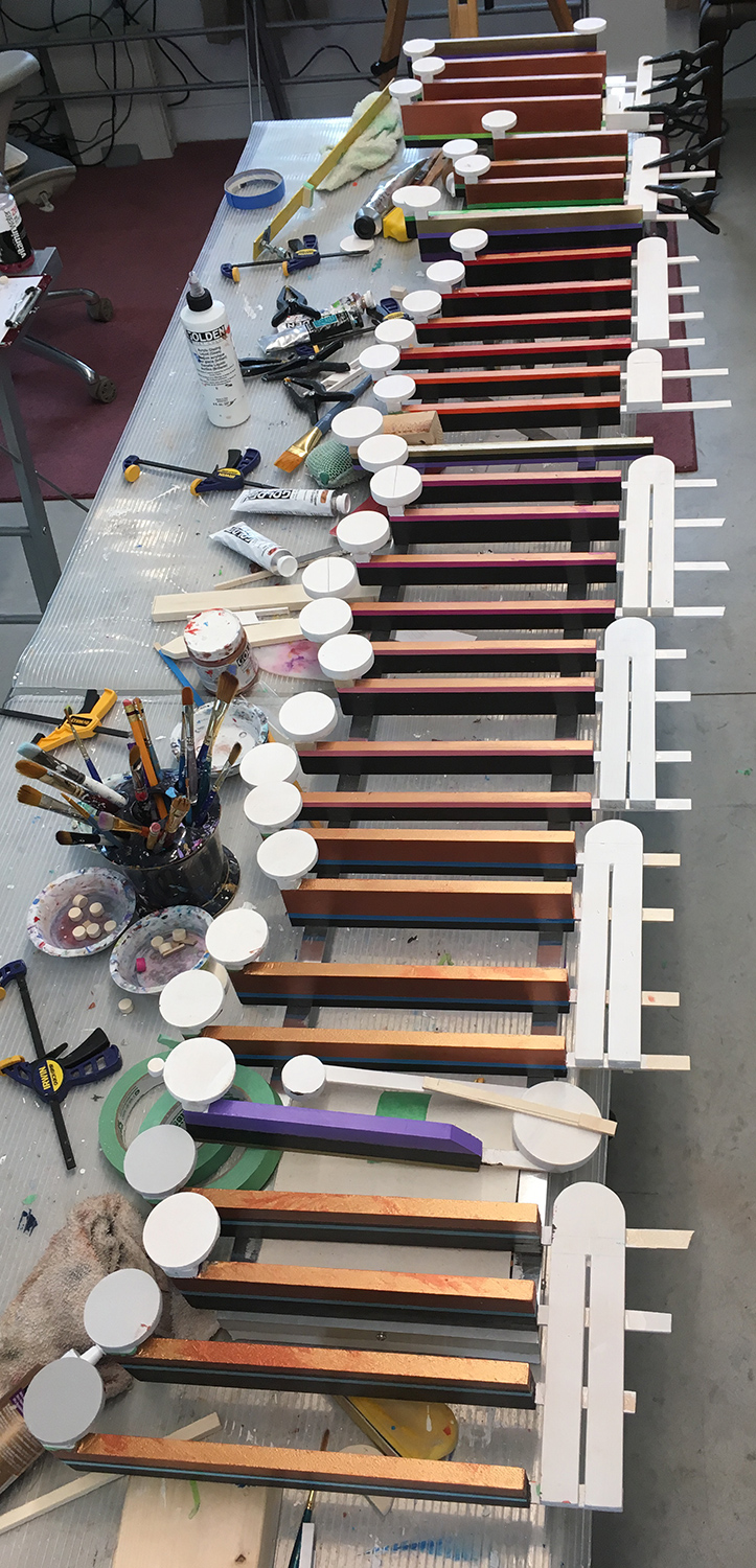 This is an artwork in progress, and not sections of a ladder with marshmallows attached to one side.  This  Mozart piece needs to be finished by June 18th, to be entered in the Inaugural art exhibition at the Pablo Center of the Confluence.  If selected this artwork will hang in exhibition on a wall, as a combination three-dimensional painting, sculpture, an assemblage artwork.  Until then,  this artwork is currently laying on a table in pieces waiting to be glued to a six-foot aluminum frame.