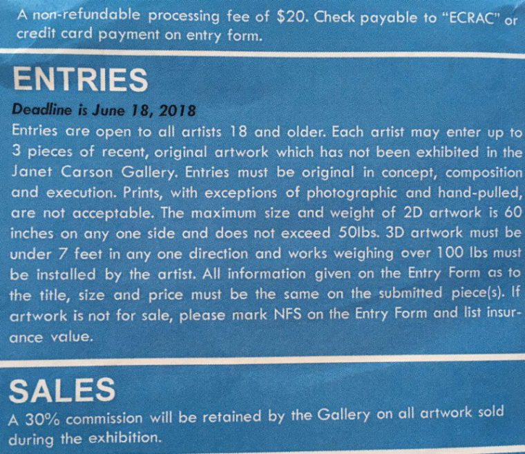 The Juror for this show is Dana Major who does “sculptural light installations and performative interactions……..,” so I find that interesting, and a small positive. What I have figured out so far about guest art jurors is that this may limit the show promoters influence on who gets invited. That also means that from year to year the quality and the making of the show can vary. For this show it is better that the Juror is from faraway Chicago, instead of locally. The idea of a Big City Artist as the judge, may work to my benefit, if she takes our local art seriously, and for me if she gets what this art is about.