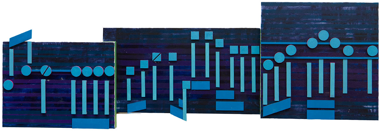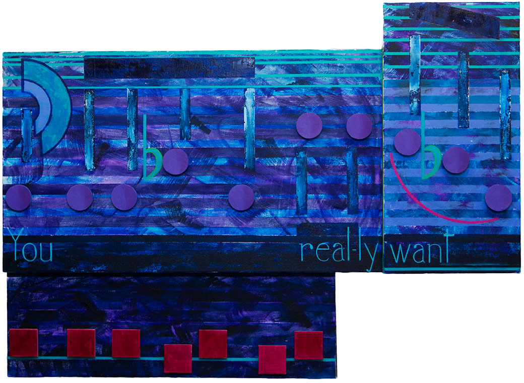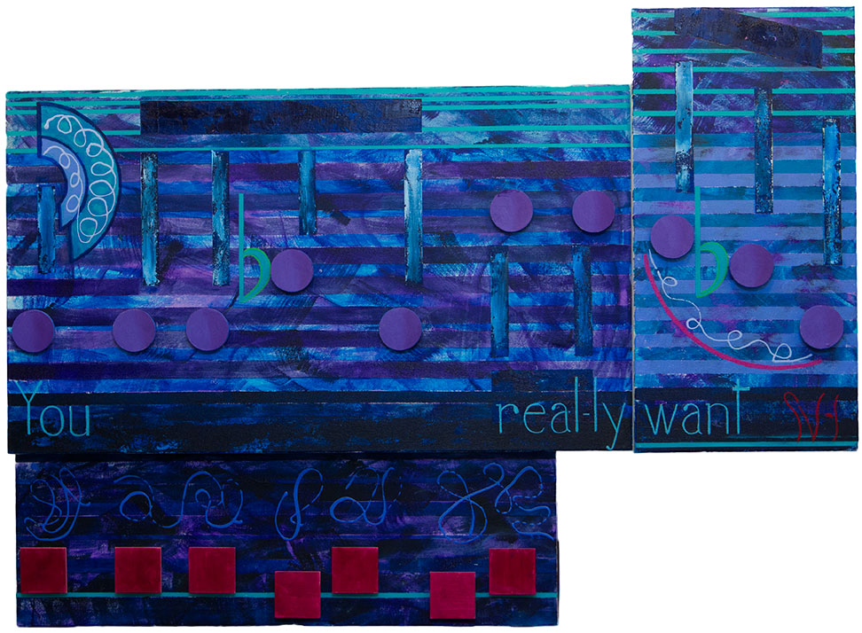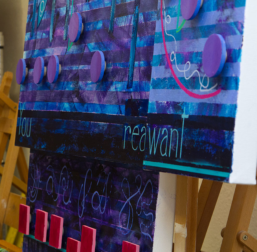 The title of this artwork is, It’s So Hard to Say Goodbye. This artwork, to my surprise, has gone from a 2015 closure piece to an experimental artwork. For the first time all the music you see in the above image I made from painted wood that rises at different levels above the background. I did not expect to be using this many pieces of wood in this work, but as the artwork progress using more wood seemed like the right thing to do. So that you can get a better feel for the why I used all of this wood here is another image that is an angled shot.