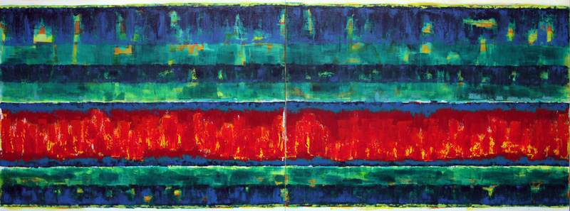 Seeing that commercial reveled a truth about this art: it is a lie it is not all about the inspiration. It is never there at the end and barely starts that way. Just look at this image and the previous one. Wow, there is a difference. And guess what it just did not just happen. It is work. It is standing back and saying, this sucks. And it is then about trial and a lot of errors. That is where things are still, with this work. The current feeling is that there is too much green. No matter what colors where put down, last night, to cover that upper green strip, above the imaginary Staff, nothing worked. It was all washed off, over and over again the rag was rinse clean of paint.