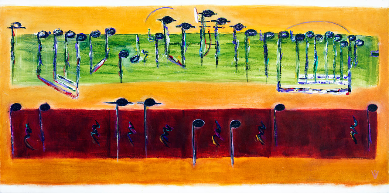 When we reached agreement on the background style and coloring, I than went even further back for another idea found in this Mozart work.  It is in this early 2006 artwork where I used a wide stripping to resemble my take on the musical staff or stave: