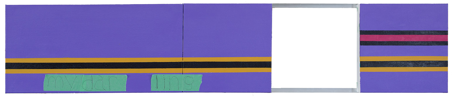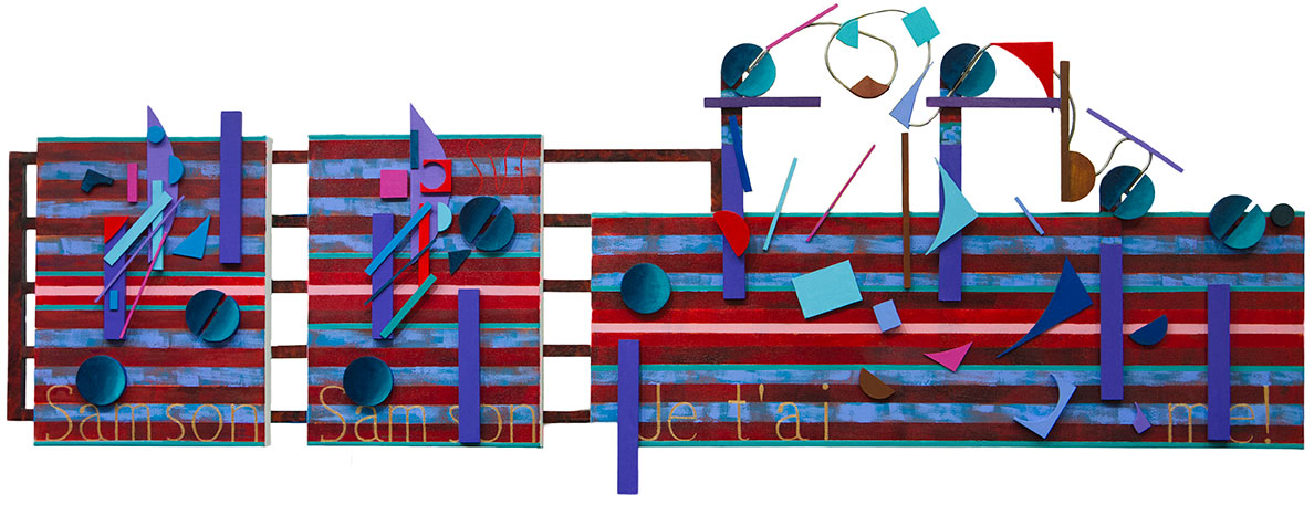When Doves Cry 2017, acrylic paint, three canvas panels with wood and aluminum added, 52.5 inches in length by 25.75 in height.