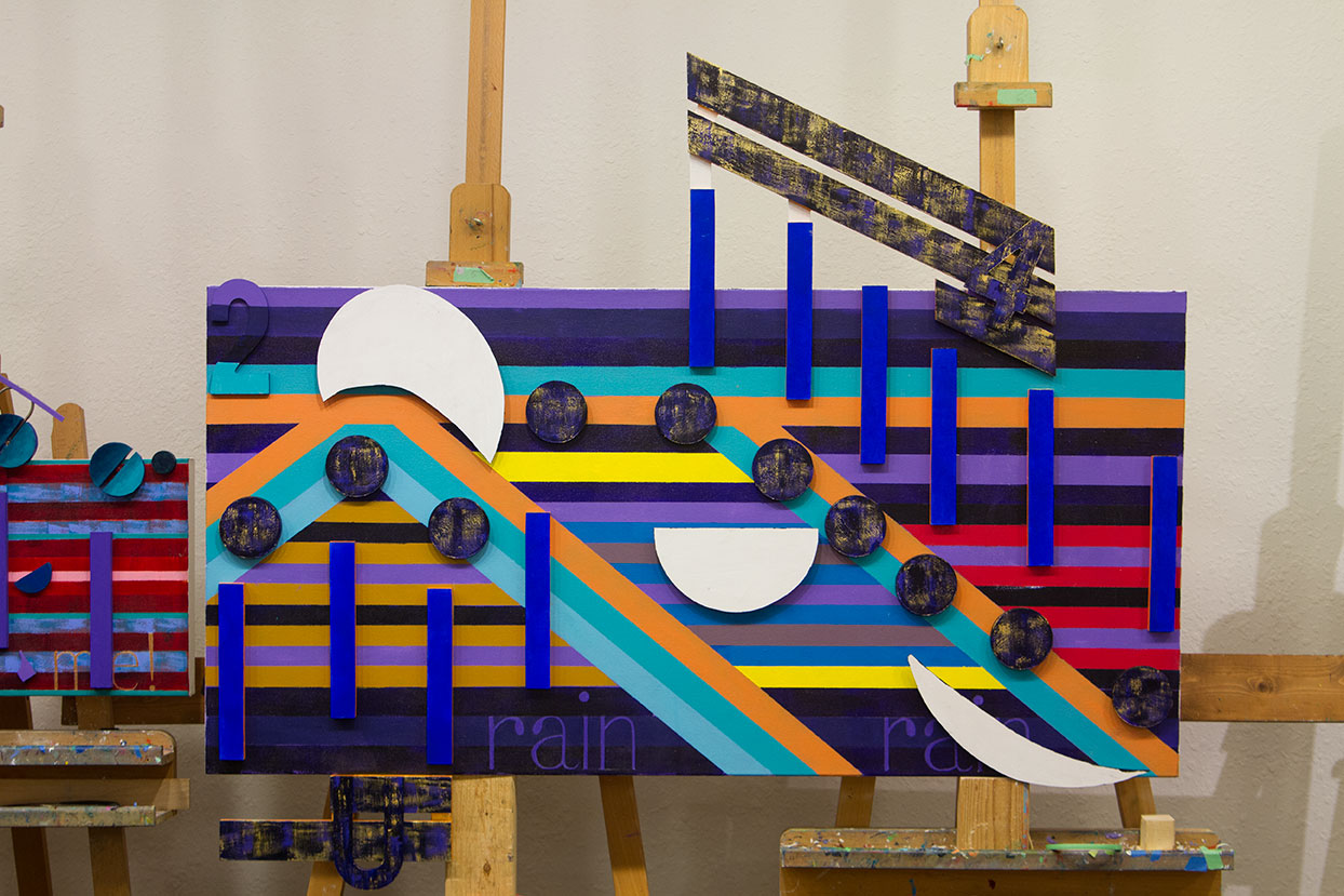 In this work two of my I beams dropped out-of-place, and needed to be removed, and re-positioned. It was not until I applied heat from a hair dryer to these misguided sticks,  that the damage to the painting dropped to almost nothing.  I was lucky that the move, and the repairs worked, and the painting is back to original condition. All of these mistakes are well deserved, and paid in full by a self-taught artist that is pushing Musical painting to extremes.