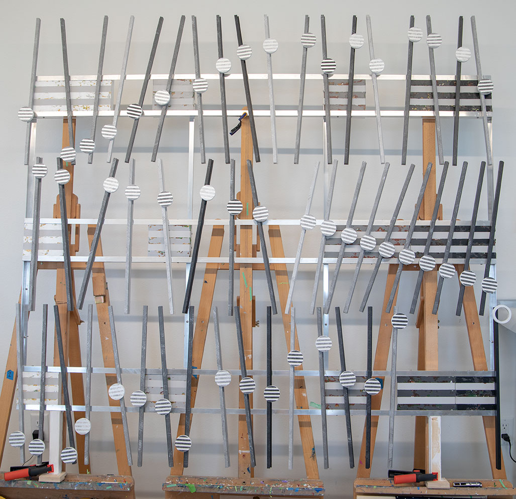 This artwork is part of the project to answer two questions: can I make larger artworks in a breakdown way so I can transport when needed. I accomplished that. I can remove the bottom section of this artwork which then allows the top two sections to fit in the back of RAV4. Second, can I lay down my music flow in a less rigid way ( a difficult task considering that I do read and understand musical notation) and move even more away from the design rules of notation. That change would not affect the casual viewer, but for those that read music (an important group of supporters), to decipher the music of the artwork would be more challenging. Here is the story behind why I came up with the second question.