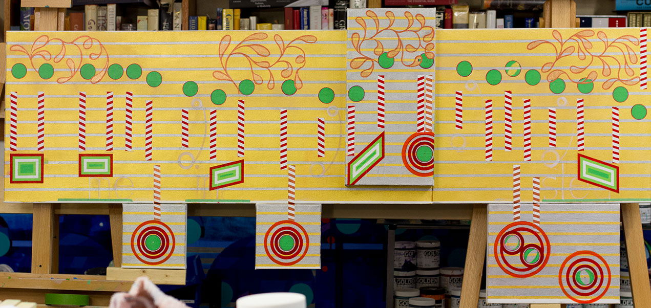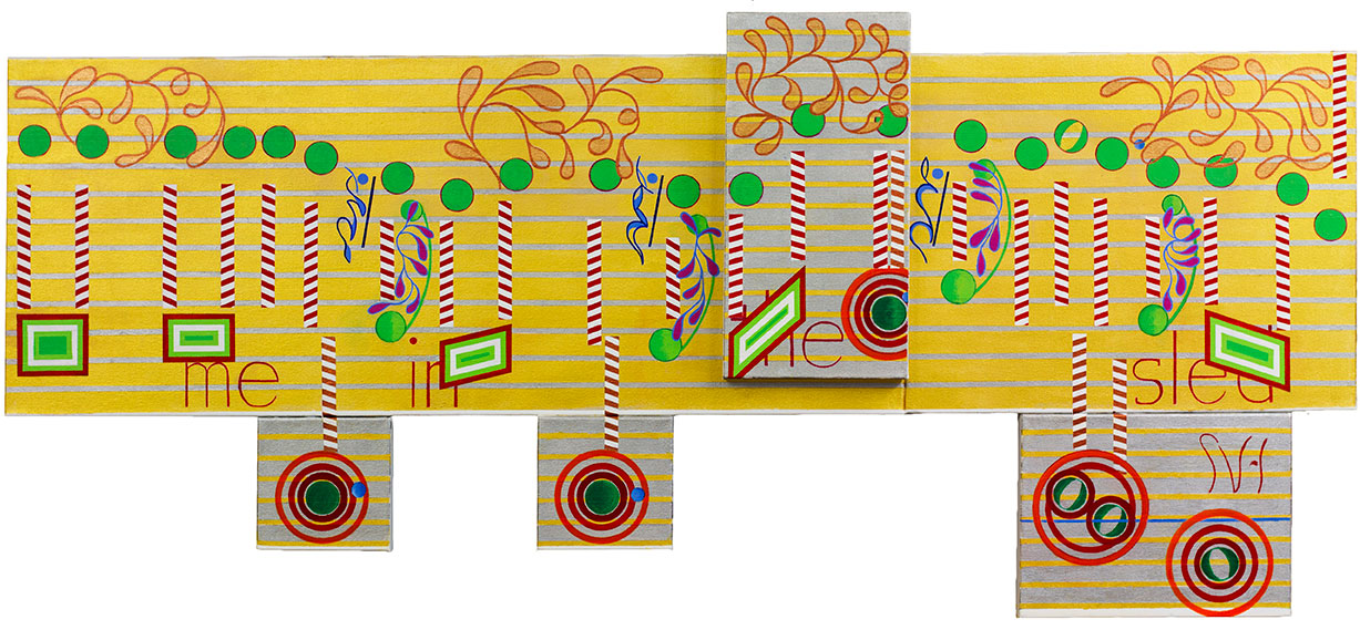 My symbols for the bell sounds, surrounded by extra circles, are nothing special, but they work, filling space while adding interest, and the opportunity to add extra canvases to make the look of this artwork, unique. My musical vine looking Slurs, you see all across the top of the canvases, and repeated in a red color in the music, give a Christmas look to the work, and fill space while pushing the music across the canvas. My red and green rectangles I like for their sharp edges counter the rounded forms of the slurs and the other rounded objects in the music. My choice of words where the best option, that balance well, and flow nicely across the painting. Still, If I would have had another choice I would have left out the word ‘me.’ I like words to connect personally to the viewer, leaving me out of the picture, but this did not work.