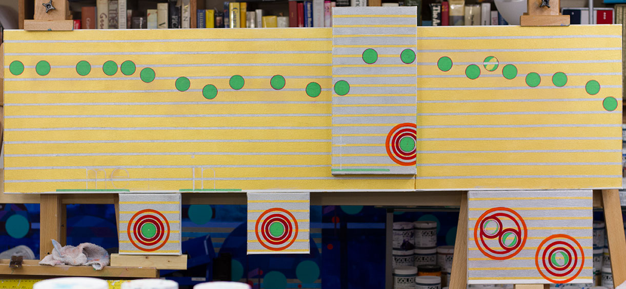 Looking at the overall finished artwork I like the look of the candy cane stems. They were a lot of work, not tedious, but time-consuming. I especially like the look of those long blue objects that are my version of musical Rests. I painted over a dozen Rests, each different from the last, in the last Vivaldi. You can see that look being carried over in this artwork. What I am seeing in my Rests, is a good solution in design that has quickly become a mature style. The Rests will certainly evolve over time, but not out of need or necessity.