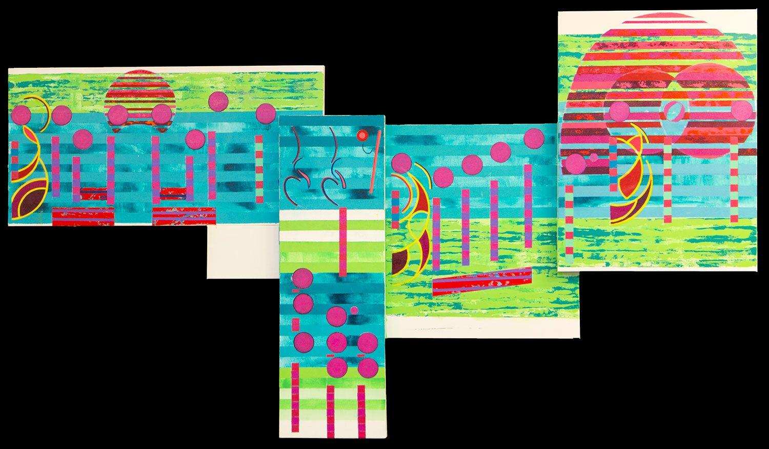 I am finally starting to feel that this work is taking on its own uniqueness. This work started out with a unique physical look that I liked. The problem has been how to paint this love song in a way that expressing the love in this music in a way that connects this painting with that one piece of music. I believe that work done on the far right panel has made that happen.  That fourth canvas reminds me of a similar panel from Up On The Roof, but these ties and slurs have found their own expression.