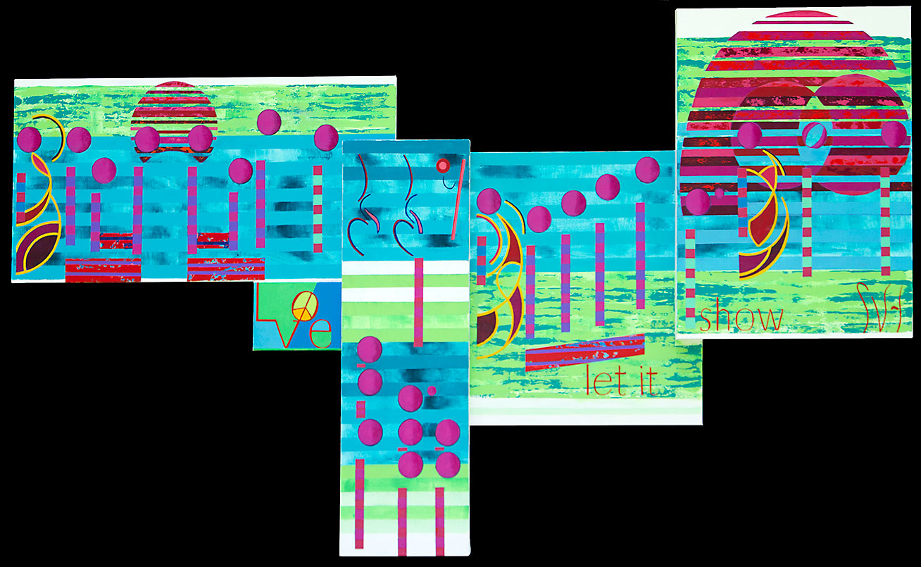 All Around reminds me of Up On The Roof, because both of these artworks last panels have a dramatic impact. An interesting difference is that second panel and how it drops well below the others. There is a pause in this music represented by those three rest symbols on the upper part of the canvas.  I could have treated those rests like I have done in most of my other works, but I wanted to add more interest to the physical look and the flow of the music. That is why you see the lower music which represents the background notes heard between the voice. We will see how this change will affect future works.