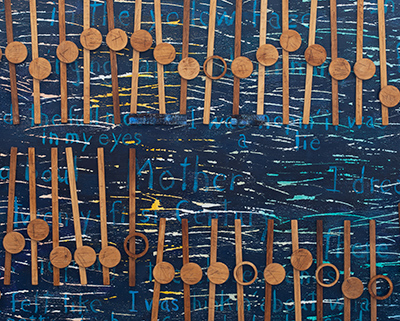 I taped a string along the top of the easel so I knew exactly where to place the top of the note’s stems. In this way, my arrangement had the correct up and down. Then excited to make sure all the notes fitted before the glue dried, I quickly attached the music, which comprised four sample sections. This well-documented concern caused me to forget to place the middle sections on different planes from the end pieces. I simply forgot to run another string. When I had finished, the top section I soon realized this error. I was beyond the time where I could safely remove any of the music without tearing away the top layer of paint. At first, I thought I would have to do the bottom layer also in one straight line, as I have done with most of my artworks over the years. This time I choose not to continue down that well-worn path. I move the bottom to two middle sections, one up and one down, and added some words along the artwork bottom to fill in as interest.