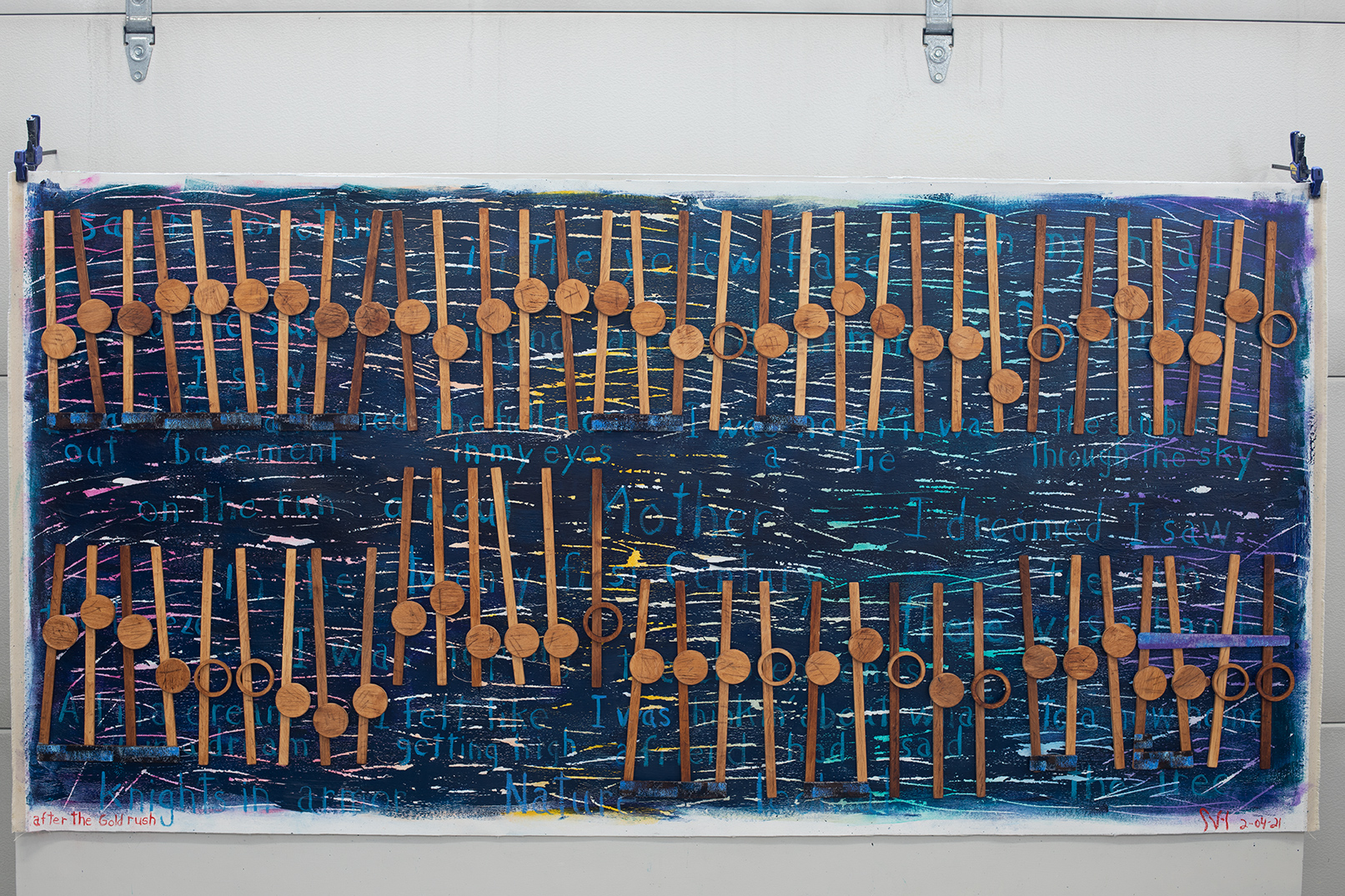 As I am writing this, I have sandwiched up this artwork and others between cardboard for safe travel. I have begun the slow removal of my temporary artist studio from a room that makes a better home office.