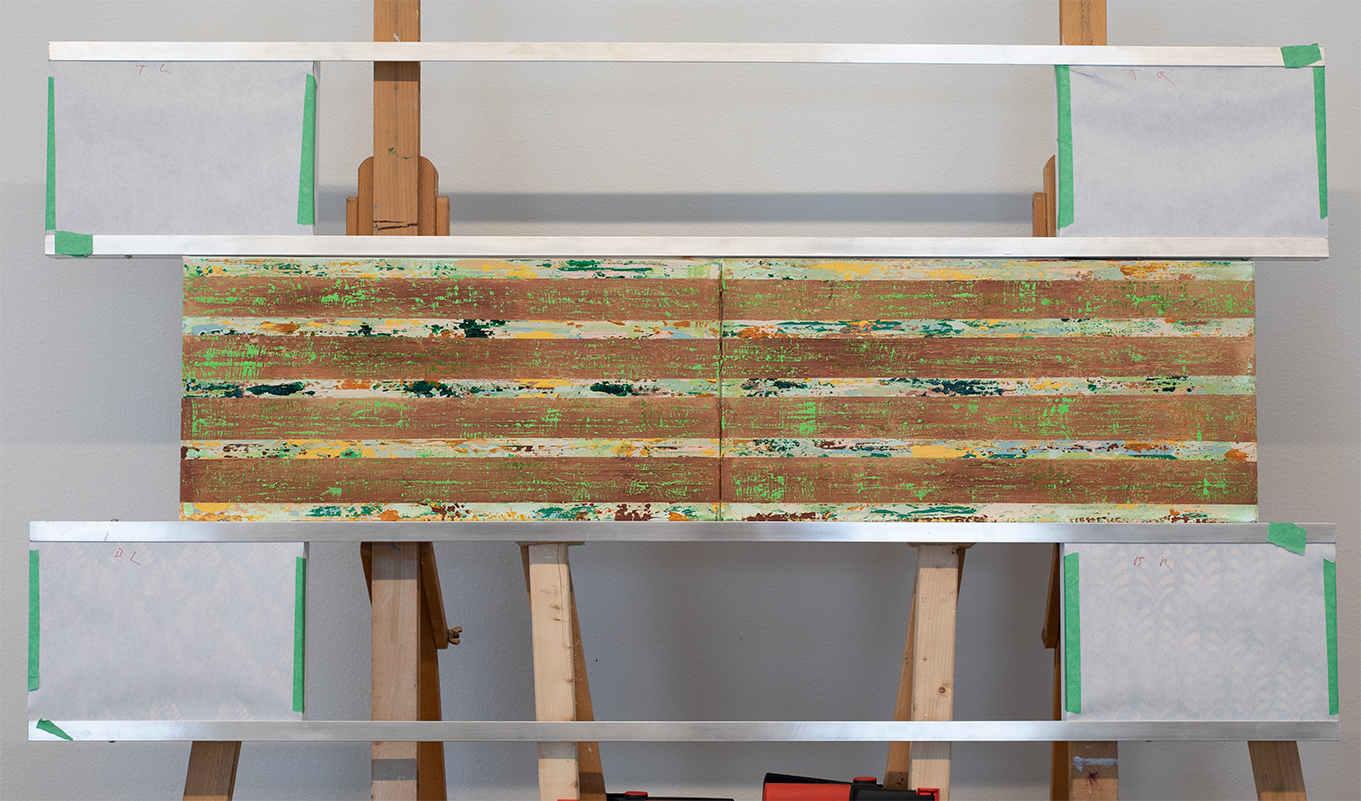 This second staged image of Africa, shows the music laid out on the background. In the past I would build these artworks one section or piece at a time, and then mount what I had to the background before moving on. With this artwork, similar to the Christmas painting, I am constructing and painting all the parts of the music before attaching anything to the background. This saves time, but doing all the construction at once can be tiresome, repetitive, and show little progress. Having all the pieces available, does cut the stress of making sure everything fits in predefined background. What stays the same, and is consistent from the very first music artwork, is that I add the music to the background from left to right.
