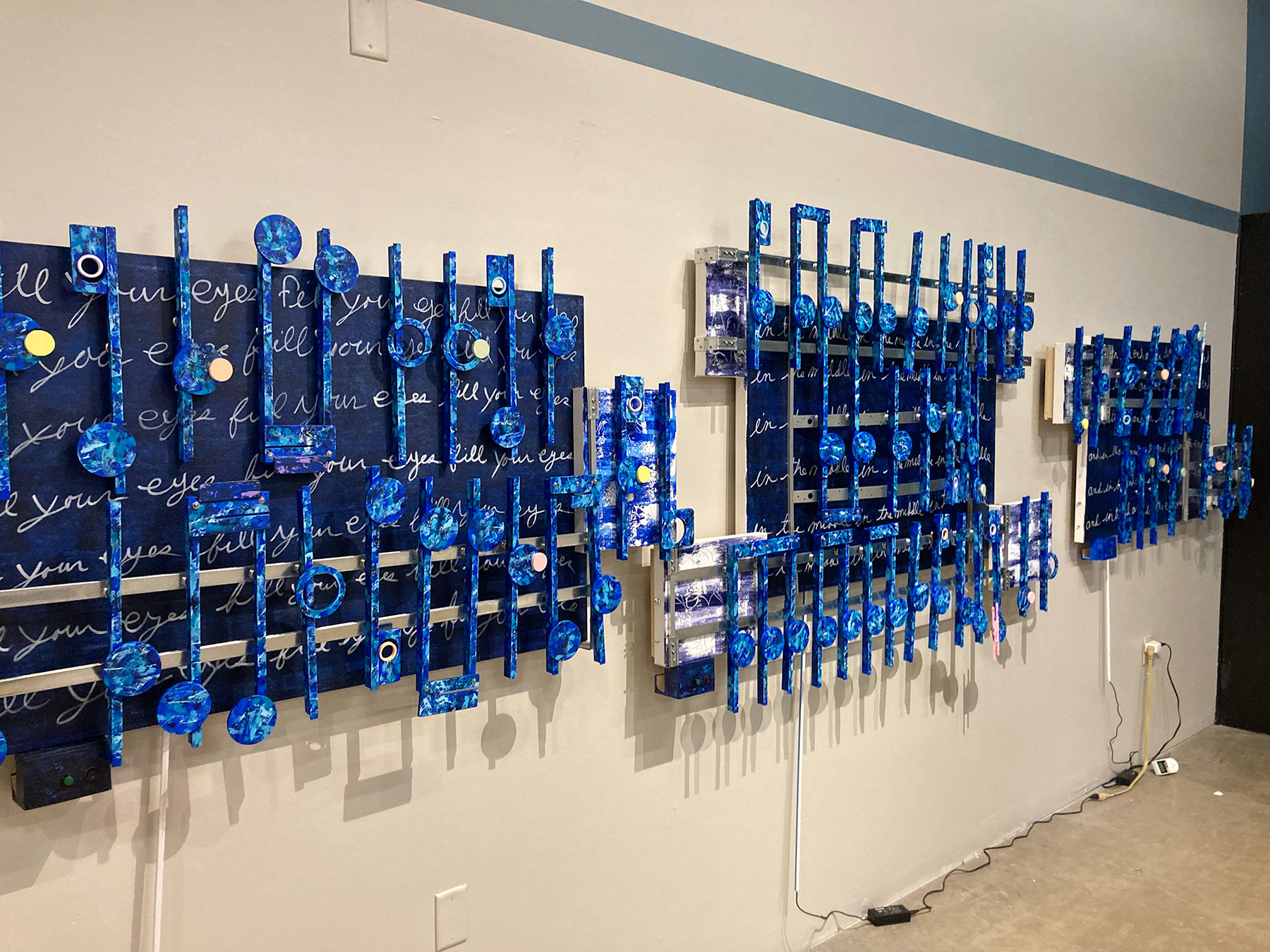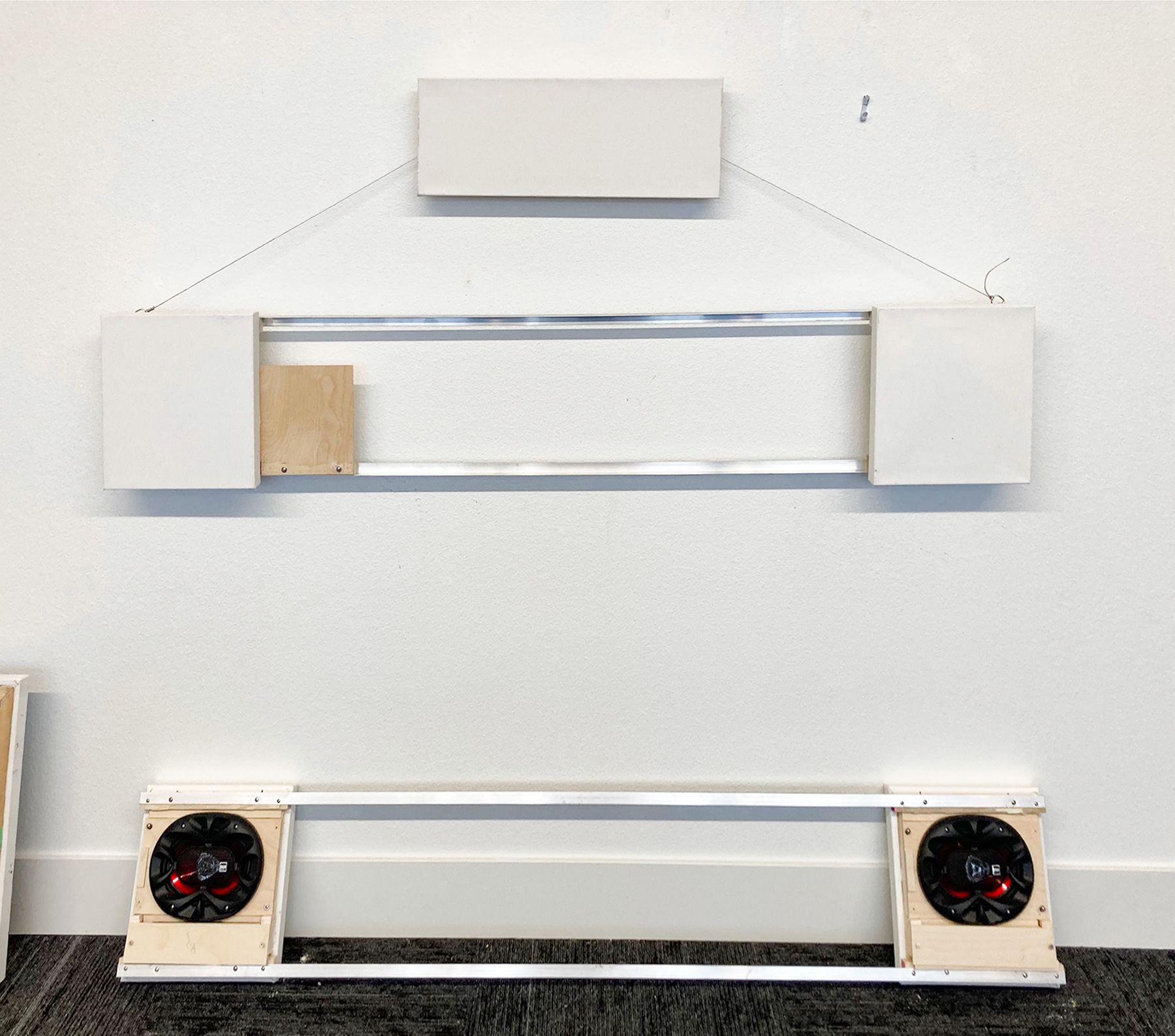 Documentation: Form my experience with the previous 4-panel project, the 4 Seasons, I wondered because of these two projects’ smaller size if I could do both at the same time. These two new projects are the first in a new series of smaller artworks that I call Essentials. The answer I found was a solid so-so. Here is what I obviously learned working on two artworks at the same time. I made a error with the installation of the speaker boxes: I did step 2 before step 1. The mistake, which became two mistakes at once, was frustrating to fix, but a durable lesson for the future. What I see that works in combination is crafting the backsides of both artworks at the same time. Once the major wood building that includes building and installing he speaker boxes mounting the speakers, installing the hanging wire and the upper hand support, the placement and drilling of the two sets of mounting screws so that I can stand the artwork upright, and finally the installation of the removable mounting board for the electronics, that then brings this phase of joint activity to an end. In creating the artwork I found I was having issues switching mental gears back an forth when it came to designing and creating the look I wanted each canvas to have to best represent the music. Once both artworks are finished, that is when I can then flip the canvases over and then build and install the stereo systems.