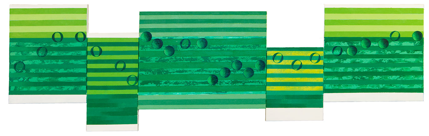 Because I had, for some unknown reason, abandon white for my musical notes, white then became the necessary theme for the stems for these notes. At first I tried all white stems, with streaks of green, similar to Image 3 of Take Five. The green dabs looked awful. There was this long pause, along with long stares. I knew as I looked at this green-shady artwork that I needed a fresh take. This artwork, and me, where both in a slump. Then a thought occurred.